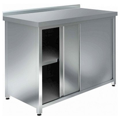 Стол производственный закрытый, серии Premium, с бортом высотой 45мм, дверями-купе, промежуточной сплошной полкой, сварным каркасом, изготовлен из нержавеющей стали AISI 430. Столешница из AISI 430 толщиной 0,7мм усилена ламинированным ДСП толщиной 16мм. Нагрузка на столешницу - до 120кг. Боковые стенки, двери, дно, сплошная полка, усиление полки (ребро жесткости) изготовлены из нержавеющей стали AISI 430 толщиной 0,7мм. Ножки стола изготовлены из квадратной трубы сечением 40х40мм, из нержавеющей стали AISI 430 толщиной 1,2мм. Регулируемые по высоте пластиковые опоры позволяют компенсировать неровности пола. Стол-тумба - универсальное нейтральное оборудование для профессиональной кухни кафе, столовой, ресторана. Удобство конструкции заключается в том, что столешница используется для разделки продуктов (фруктов, овощей, мяса, рыбы), приготовления блюд, а в тумбе хранится посуда и прочий инвентарь.