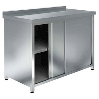 Стол производственный закрытый, серии Стандарт, с бортом высотой 45мм, дверями-купе, промежуточной сплошной полкой, сварным каркасом - универсальное нейтральное оборудование для профессиональной кухни кафе, столовой, ресторана. Удобство конструкции заключается в том, что столешница используется для разделки продуктов (фруктов, овощей, мяса, рыбы), приготовления блюд, а в тумбе хранится посуда и прочий инвентарь. Столешница и двери изготовлены из нержаеющей стали AISI 430 толщиной 0,7мм. Нагрузка на столешницу - до 120кг. Боковые и задняя стенки, дно, сплошная полка, усиление полки и дна изготовлены из оцинкованной стали толщиной 0,7мм. Ножки стола изготовлены из оцинкованной стали (уголок 40х40 мм) толщиной 1,5мм. Отступ ног - 15мм. Регулируемые по высоте пластиковые опоры позволяют компенсировать неровности пола.
