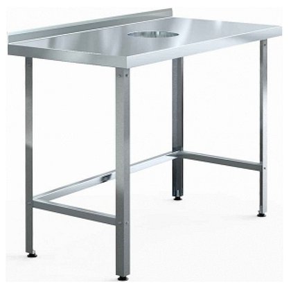 Стол производственный для сбора отходов, сборно-разборный открытый пристенный, серии Standart, с бортом высотой 45мм, отверстием для сбора отходов D220мм по центру, столешницей из пищевой шлифованной нержавеющей стали AISI430 толщиной 1мм оснащён подложкой из ламинированного ДСП толщиной 16мм, рамкой столешницы из оцинкованной стали толщиной 1,5мм, Z-образными креплениями столешницы из нержавеющей стали толщиной 0,7мм, обвязкой с 3-х сторон из оцинкованной стали толщиной 0,7мм, разборным каркасом из оцинкованного гнутого углового профиля 40х40мм толщиной 1,5мм, регулируемыми по высоте пластиковыми опорами ножек. Максимальная равномерно распределенная нагрузка на столешницу - до 150кг. Ножки отгружаются отдельно.