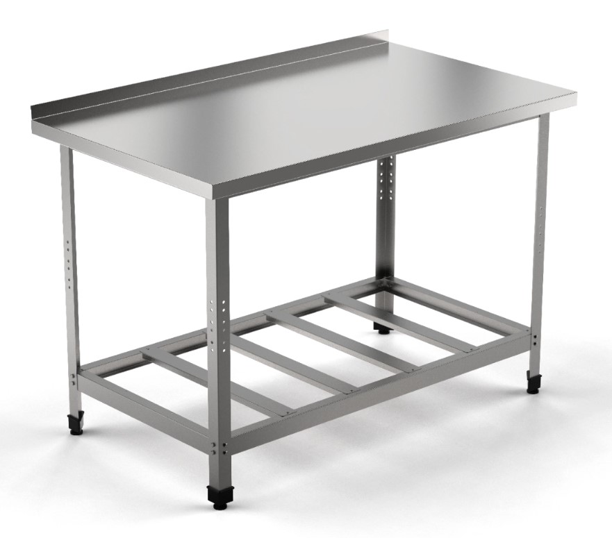 Стол производственный EKSI СПБП 1000/600-с ("Стандарт", борт, полка-решетка-1шт., расст. м/у реш.200мм) предназначен для раскатки теста и обработки ингредиентов для приготовления блюд на предприятиях общественного питания и торговли. Модель оснащена бортом. Разборный каркас выполнен из оцинкованного уголка, столешница - из нержавеющей стали AISI 430, усиленной листом ЛДСП.