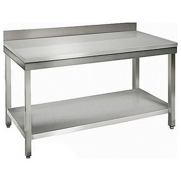 Стол рабочий ТТМ СРН1-180/7П имеет ножки из нержавеющей стали, один борт и сплошную полку.