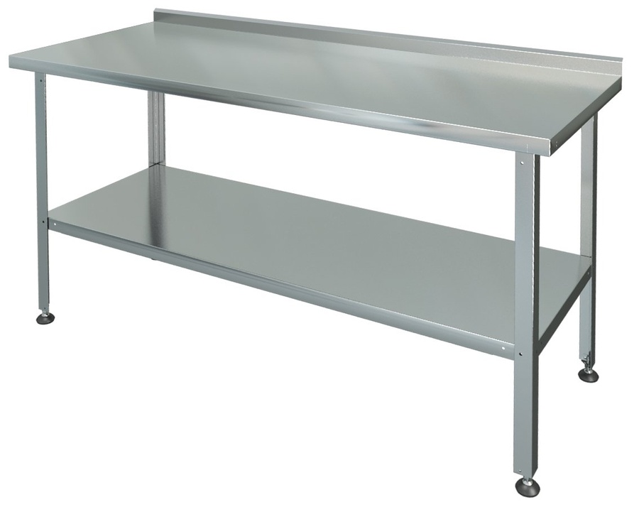 Столешница стола, усиленная подложкой из ЛДСП толщиной 15 мм, выполнена из нержавеющей стали AISI 430 толщиной 0,5 мм, каркас - из оцинкованного уголка толщиной 1+1 мм, ножки с регулиремыми опорами - из оцинкованного стального уголка 40х40 мм с подгибом краёв во внутрь толщиной 1,0 мм. Изделие оснащено практичной сплошной полкой из нержавеющей стали и одним бортом.