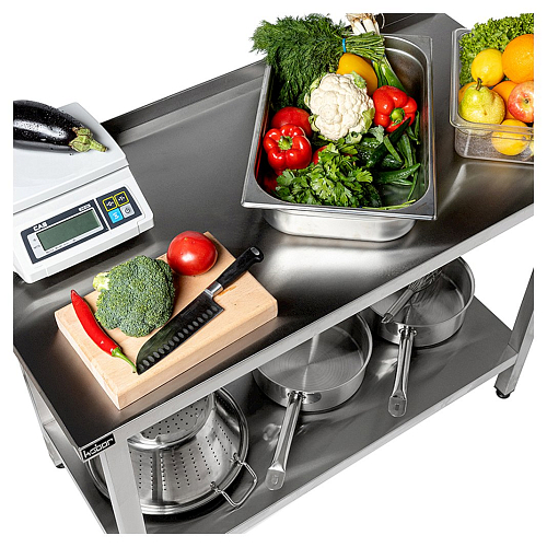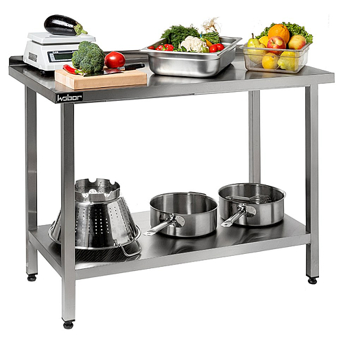 Столешница стола Koбор СПБ-90/60 произведена из высококачественной нержавеющей стали, а также для увеличения прочности и во избежание прогибания укреплена ламинированной древесно-стружечной плитой толщиной 16 мм. Ножки стола регулируются по высоте, что помогает избежать наклона рабочей поверхности стола. Товар поставляется в разобранном виде и в упаковке для облегчения транспортировки.
