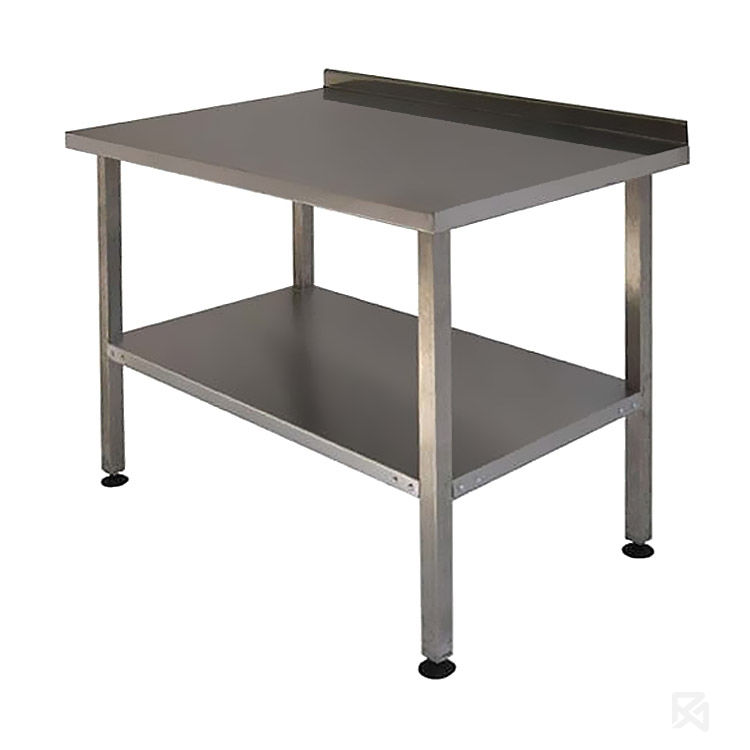 Стол с бортом изготовлен из нержавеющей стали толщиной 0,8 мм, столешница и полка с подложкой из ДВП высокой плотности.