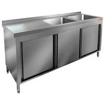 Стол HICOLD НСЗК2М-15/7БП служит для мытья тарелок, стаканов, ложек, вилок, кастрюль, сковородок и другой кухонной посуды на предприятиях общественного питания. Оборудование оснащено бортиком, дверцами-купе и двумя моечными ваннами справа.