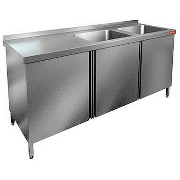 Стол HICOLD НСЗ2М-15/7БП служит для мытья тарелок, стаканов, ложек, вилок, кастрюль, сковородок и другой кухонной посуды на предприятиях общественного питания. Оборудование оснащено бортиком, распашными дверцами и двумя моечными ваннами справа.