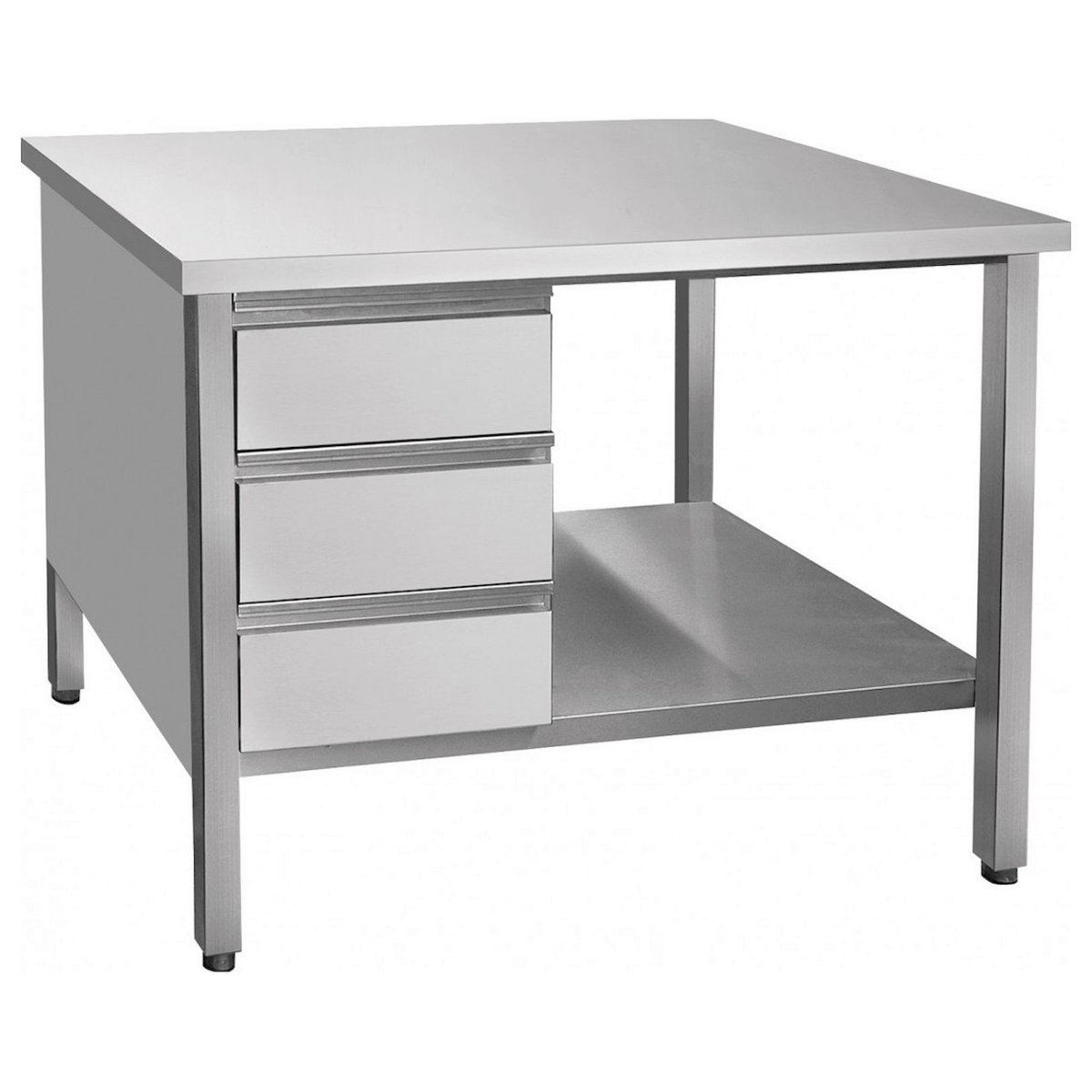 В столе имеются три выдвижных ящика. Все детали стола изготовлены из нержавеющей стали. Ножки с резиновыми вставками регулируются по высоте.