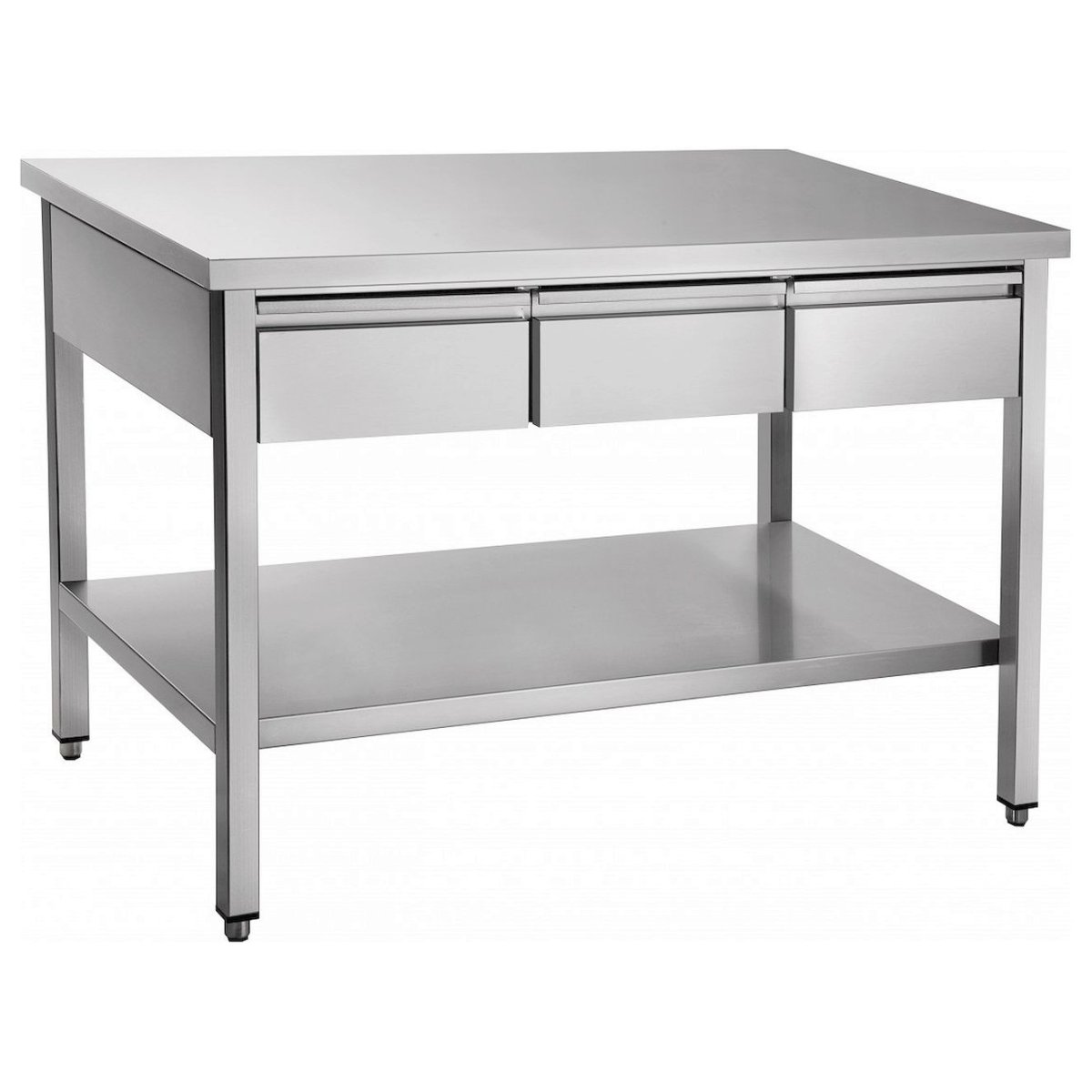 В столе имеются три выдвижных ящика. Все детали стола изготовлены из нержавеющей стали. Ножки с резиновыми вставками регулируются по высоте.
