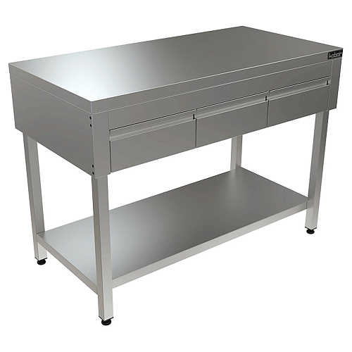 Стол с выдвижными ящиками КОБОР СПЯ-40/70/П - широко применяется в различных производственных цехах предприятий общественного питания, супермаркетах, комбинатах пищевой промышленности для разделывания и обработки пищевых продуктов, а также в качестве вспомогательной поверхности для кухонного оборудования.