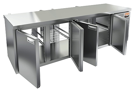 Внутри стола расположен воздухоохладитель с вентиляторами, которые обеспечивают равномерное и быстрое распределение холодного воздуха внутри полезного объема стола. В полезном объеме предусмотрены полки-решетки для укладки продуктов в герметичной упаковке. Полки, направляющие полок и стойки выполнены по стандарту GN – полная совместимость с комплексом профессионального кухонного оборудования. Нагрузка до 50 кг на каждую полку.