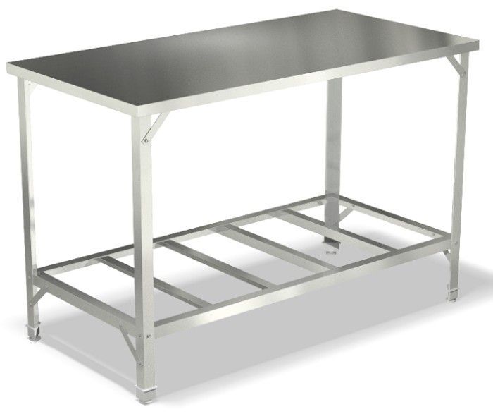 • Стол производственный без борта, столешница из нержавеющей стали AISI 430 толщиной 0,5 мм с подложкой ДСП толщиной 16 мм.