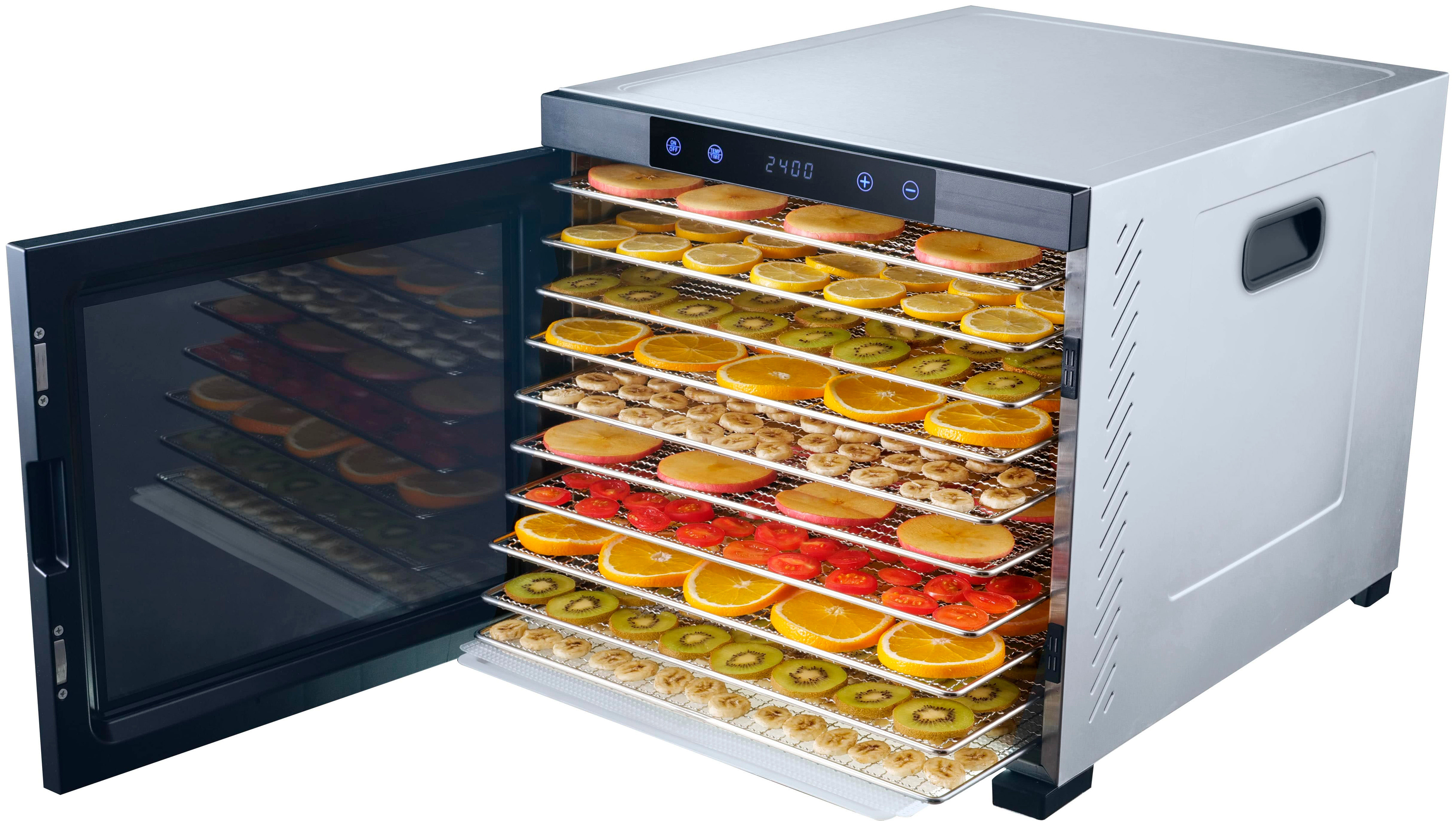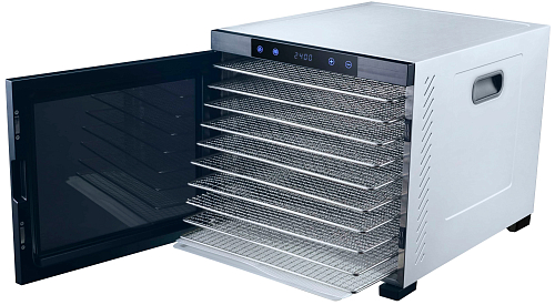 Вентилятор, установленный в камере, обеспечивает горизонтальное распределение воздуха и равномерное извлечение влаги из камеры. Дегидрация продуктов значительно увеличивает срок их хранения без потери полезных свойств. Для выбора температурного режима и времени сушки в устройстве используется удобная электронная панель управления.
