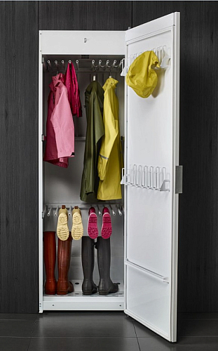 Сушильный шкаф ASKO DC7774V.W отличается современным дизайном, который прекрасно впишется в интерьер прачечной или другого аналогичного помещения. Его корпус выполнен из высококачественной стали, что придаёт ему прочность и долговечность. Фасад прибора выкрашен в белый цвет, который легко сочетается с другой бытовой техникой по уходу за бельем. Внутри расположено множество полочек, держателей и вешалок. Есть специальный отсек для перчаток. С ним даже «капризные» изделия не сядут и не потеряют форму. Ящик для обуви позволяет сушить кожаные ботинки и резиновые сапоги. Материал не портится и не лопнет.