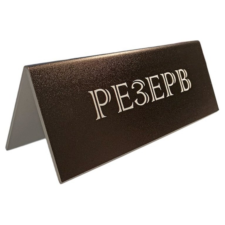Табличка Резерв черная двусторонняя с английским эквивалентом русского слова. Размер двусторонней таблички 210х80 мм. Универсальна в применении для заведений общепита. Безопасная, ударопрочная табличка которая прослужит долго.