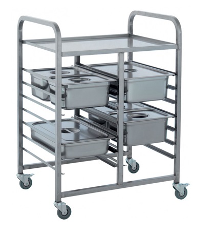 • Направляющие имеют концевые отгибы, обеспечивающие фиксацию гастроемкостей и предотвращающие их выпадение при движении тележки