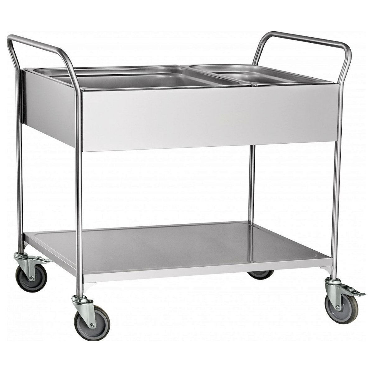 Тележка для сбора посуды Abat (Чувашторгтехника) ТС-100 применяется для складирования и транспортировке посуды к мойке на предприятиях общественного питания. Тележка укомплектована двумя гастроемкостями: GN 1/1x150 и GN 2/1x200. Все детали тележки изготовлены из нержавеющей стали.
