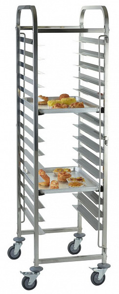 Тележка для противней VIATTO RT6415 используется для хранения и транспортировки противней и подносов на предприятиях общественного питания и торговли. Корпус выполнен из нержавеющей стали.