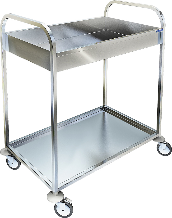 Тележка для сбора посуды и сервировки Техно-ТТ ТП-221 предназначена для доставки готовых блюд, сбора тарелок, чашек и стаканов со столов на предприятиях общественного питания и торговли. Модель оснащена 2 полками и 4 колесами, 2 из которых с тормозными устройствами. Разборный каркас выполнен из квадратной трубы из нержавеющей стали AISI 304, полки - из нержавеющей стали AISI 304.
