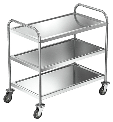 • Тележка состоит из каркаса, выполненного из нержавеющей круглой трубы D25мм, неглубоких полок из нержавеющей стали и четырех колес D100мм с бамперами D86х25мм.