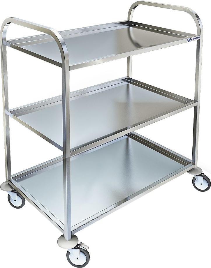 Тележка сервировочная Kayman ТС-11/3 используется на предприятиях общественного питания для доставки готовых блюд, сбора тарелок, чашек и стаканов со столов. Каркас выполнен из нержавеющей трубы AISI 304 20х20 мм толщиной 1,2 мм, полки - из нержавеющей стали AISI 304 толщиной 0,8 мм.