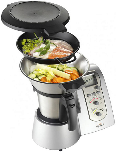Для приготовления используется чаша с универсальным ножом, соответственно, не меняя насадок можно делать множество операций – измельчать, шинковать и натирать овощи и фрукты, замешивать тесто, взбивать сливки, готовить соусы смузи, супы-пюре, а также мясо, рыбу и овощи на пару.