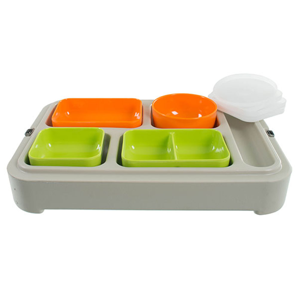 Для транспортировки подносы оборудованы специальными зажимами, которые обеспечивает фиксацию внутренних емкостей. Транспортировка и использование термоподноса возможна только в горизонтальном положении. Внутренние емкости (формы) имеют определенный объем и форм-фактор. Формы имеют верхние крышки, но могут быть негерметичными для воды.