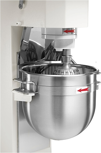 На защитной решётке и деже предусмотрен микровыключатель. Корпус покрыт стойкой к механическим воздействиям краской, ёмкость и венчик – из нержавеющей стали AISI 304, защита ёмкости – из поликарбоната, крюк и лопатка – из алюминия.
