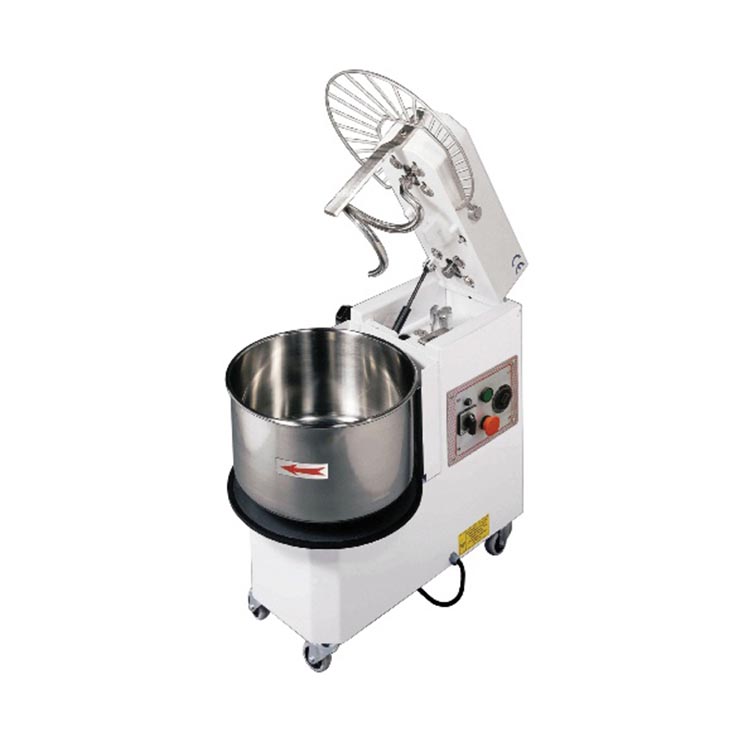 Один двигатель приводит в движение дежу и спираль изготовленные из нержавеющей стали. Специальная оптимизированная форма спирали с фиксированным упором в сочетании с грамотно подобранным соотношением оборотов вращения дежи и спирали позволяют с легкостью получать большую часть сортов теста. Защитная решетка из нержавеющей стали блокирует работу в случае поднятия спирали и позволяет производить загрузку ингредиентов без остановки замеса. Панель управления расположена сбоку и позволяет задать время замеса.