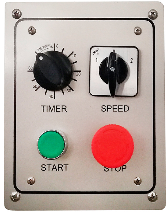 • Панель управления аналоговая: переключатель скоростей, кнопка пуска и кнопка аварийной остановки, таймер