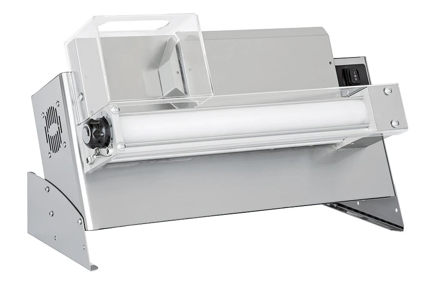 • Тестораскатка оснащена электрической педалью управления, загрузочным отсеком и двумя валками из поликарбоната.