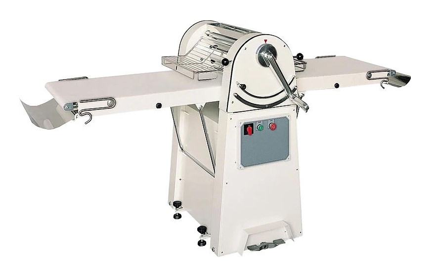 Тестораскаточная машина Kemplex SF 500/950 используется на предприятиях общественного питания для раскатывания теста различной влажности. Оборудование оснащено ножной педалью для управления, складными крыльями, съемными скребками для легкой очистки и колесиками для удобного перемещения. Защитные решетки выполнены из нежавеющей стали, ролики - полированные с покрытием из хрома.