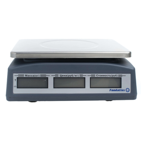 Электронные весы Foodatlas с торговыми функциями. Материал платформы: нержавеющая сталь + пластик. Яркие ЖК-индикаторы с подсветкой: вес, цена, стоимость. Память на 8 товаров.