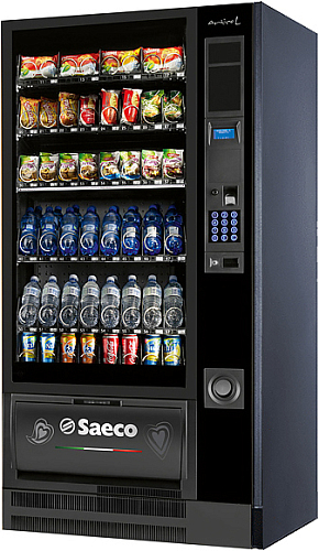 Торговый автомат SAECO Artico L Food предназначен для размещения и продажи в нем упакованной продукции в гостиницах, офисах, на предприятиях общественного питания и торговли и позволяет поддерживать необходимую температуру в постоянном режиме. Сухарики, чипсы, шоколадные батончики, напитки, орешки, сэндвичи и др. продукты помещаются в лотки со спиралями. При вращении спирали выбранный продукт попадает непосредственно в окошко выдачи. Корпус выполнен из стали.