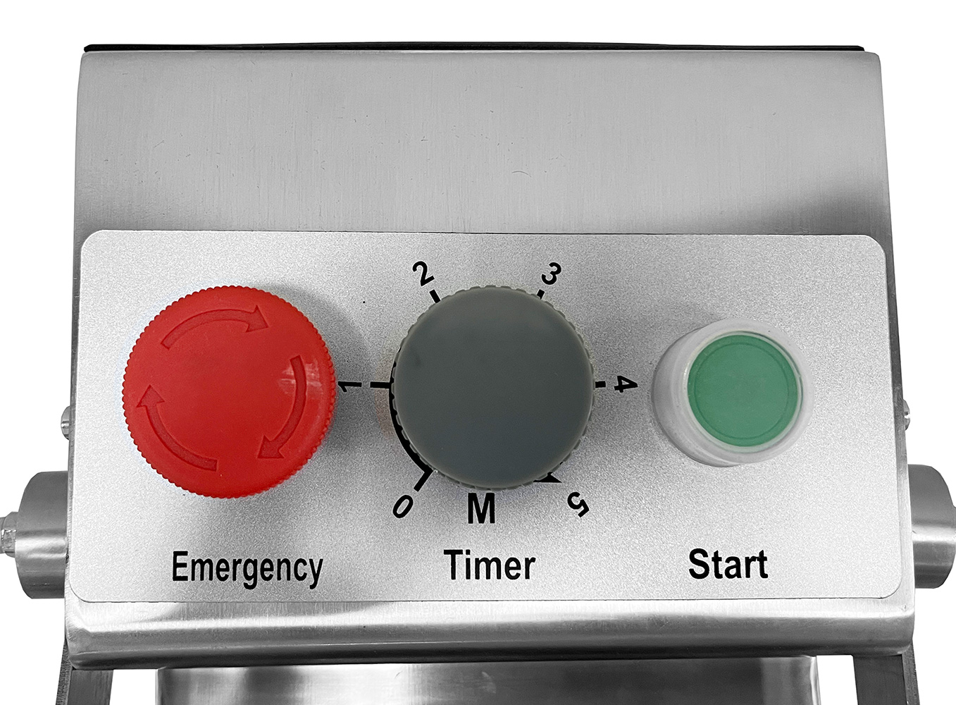 • Механическая панель управления: кнопка включения, таймер до 5 мин, кнопка аварийной остановки.