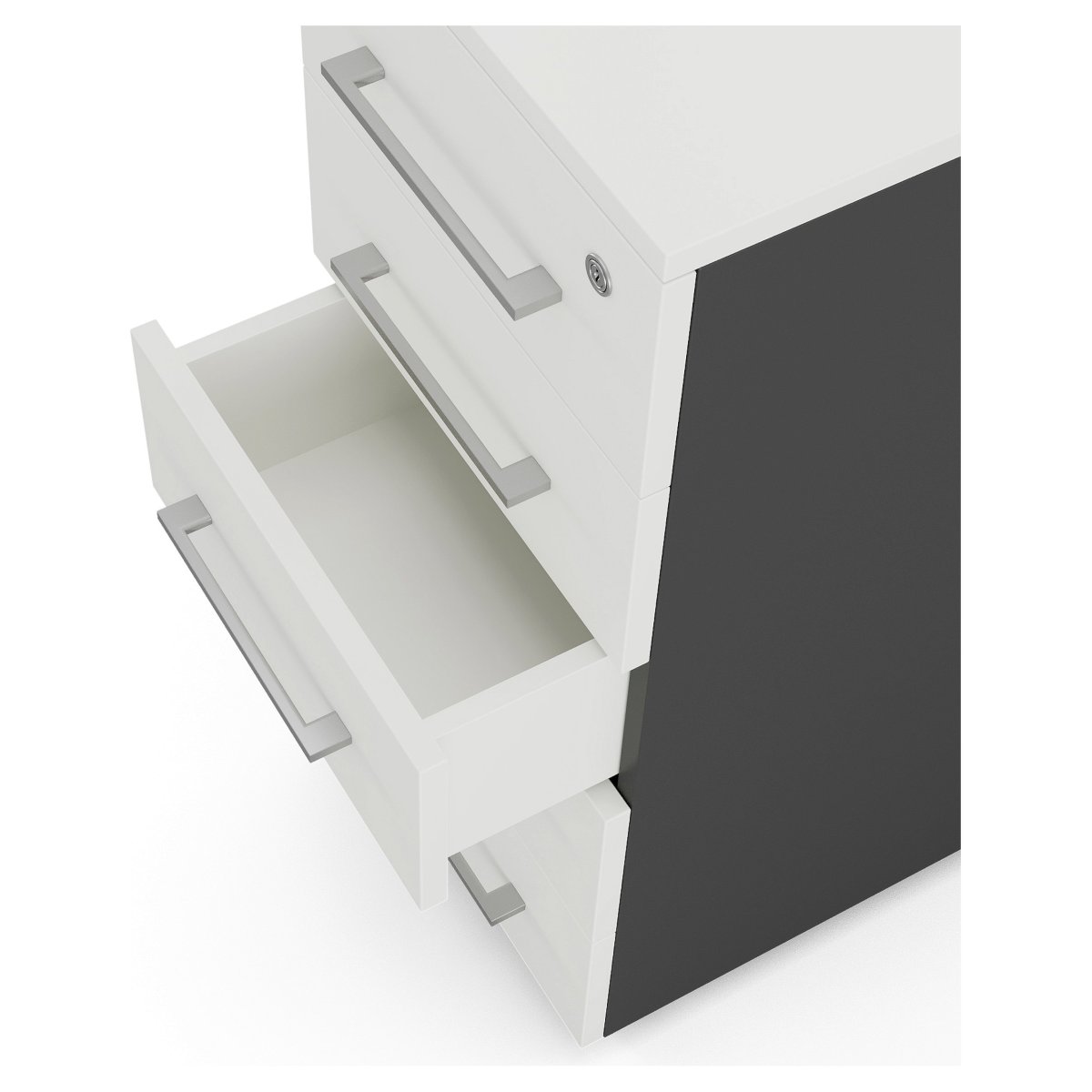 В комплект приставной офисной тумбы от компании Kobor входят доводчики, обеспечивающие плавное и бесшумное закрытие ящиков и дверей.