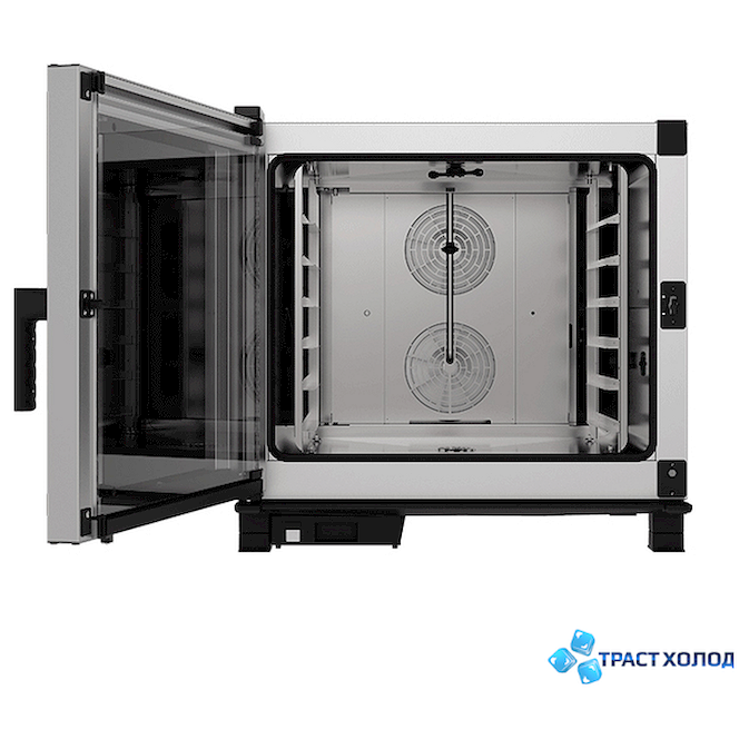 Модель имеет двухярусную колонку MAXI.LINK, которая позволяет одновременно выпекать продукты с разными требованиями температуры, влажности и времени приготовления. Профилированные направляющие, изготовленные из нержавеющей стали, имеют L-образную форму для удобной загрузки гастроемкостей.