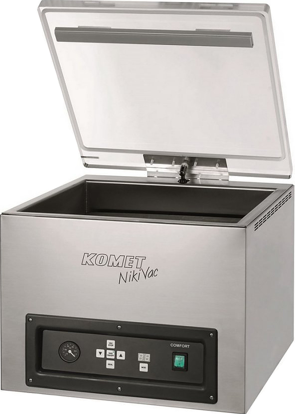 Упаковщик вакуумный однокамерный настольный KOMET NIKIVAC используется на предприятиях общественного питания и торговли для вакуумной упаковки мяса, приправ, сухофруктов, хлебобулочных изделий, медикаментов, гранулированных, порошкообразных и жидких продуктов. Модель оснащена легкозаменяемой беспроводной запаечной планкой и заполняющими пластинами для регулирования высоты. Корпус выполнен из нержавеющей стали, крышка - из оргстекла.