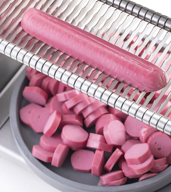 • Нарезает сосиски на кусочки шириной по 6 мм