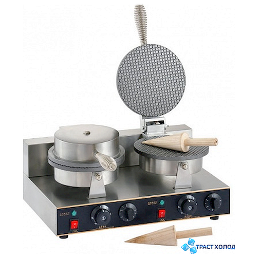 Настольная электрическая вафельница Gastrorag ZU-XGP-2 для тонких круглых вафель используется в небольших заведениях общественного питания и на торговых предприятиях. У этого оборудования есть две зоны нагрева с антипригарным покрытием, регулируемый термостат, также в комплекте прилагаются два деревянных конуса для изготовления вафельных рожков.