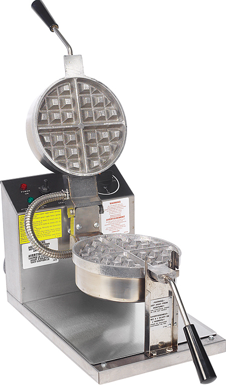 Круглая с четырьмя круглыми сегментами диаметром 180 мм, каждый для выпекания бельгийских вафель, оснащена встроенным таймером.