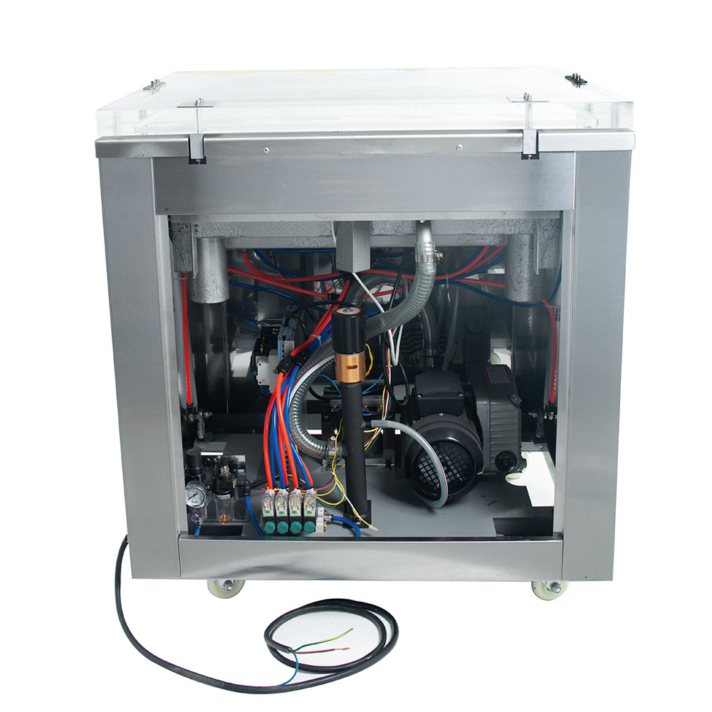 При нажатии на крышку вакуумного корпуса, машина автоматически совершает следующие процессы: вакуумная экстракция, аэрация упорядоченных предполагаемых процессов вакуумной экстракции, аэрация внутреннего газа, герметизация, печать, охлаждение и аэрация, распределение продукта упаковки по пакету (вибростол).