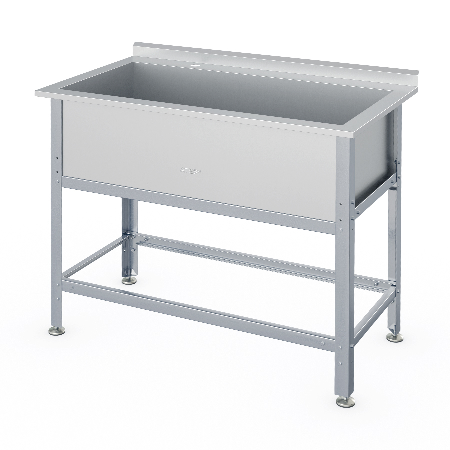 Ванна Atesy ВСМ-Б-1.1450.700-1-02 (ВМ-1/700/1550 с бортом) устанавливается на предприятиях общественного питания и торговли для мытья столовой и кухонной посуды, инвентаря, овощей и фруктов, а также для оттайки замороженных пищевых продуктов. Ванна из нержавеющей стали AISI 430 толщиной 0,7 мм, опорная ножка из пластика, опоры регуляторов высоты ножек из нержавеющей стали.