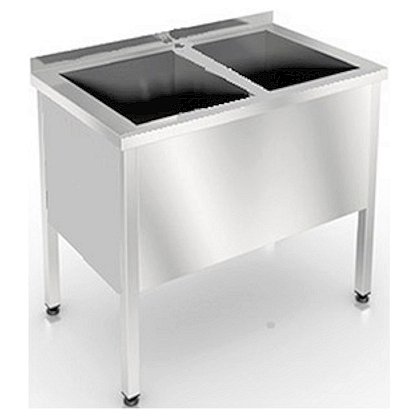 Ванна котломоечная открытая пристенная, серии Премиум-2, с бортом 45мм, 2 сварными мойками 480х420х400мм из нержавеющей стали 430 1мм, отверстием D35мм под смеситель (заглушка в комплекте), выпуском оснащена сварным каркасом из профильной трубы квадратного сечения 40х40х1,2мм из нержавеющей стали AISI 430, фартуком с 3-х сторон из нержавеющей стали 430 1мм, регулируемыми по высоте пластиковыми опорами. Отступ ног - 130мм.