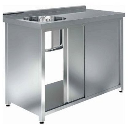 Ванна моечная закрытая (без задней стенки) пристенная, серии Premium, с бортом высотой 45мм, 1 цельнотянутой мойкой 400х400х300мм из нержавеющей стали AISI 304 слева, рабочей поверхностью справа, дверями-купе, имеет сварной каркас из нержавеющей стали AISI 430. Столешница из нержавеющей стали AISI 430 толщиной 1мм усилена ламинированным ДСП толщиной 16мм. Максимальная равномерно распределенная нагрузка на столешницу - до 120кг. Борт препятствует попаданию отходов сырья и влаги в пространство между ванной и стеной. Боковые стенки, двери, дно изготовлены из нержавеющей стали AISI 430 толщиной 0,7мм. Ножки изготовлены из квадратной трубы сечением 40х40мм, из нержавеющей стали AISI 430 толщиной 1,2мм. Регулируемые по высоте опоры позволяют компенсировать неровности пола.