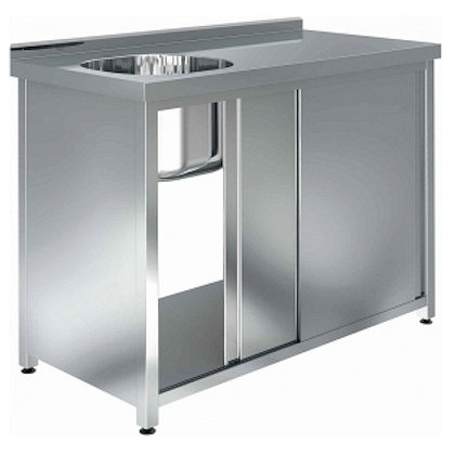 Ванна моечная закрытая (без задней стенки) пристенная, серии Premium, с бортом высотой 45мм, 1 цельнотянутой мойкой 500х500х300мм из нержавеющей стали AISI 304 слева, рабочей поверхностью справа, дверями-купе, имеет сварной каркас из нержавеющей стали AISI 430. Столешница из нержавеющей стали AISI 430 толщиной 1мм усилена ламинированным ДСП толщиной 16мм. Максимальная равномерно распределенная нагрузка на столешницу - до 120кг. Борт препятствует попаданию отходов сырья и влаги в пространство между ванной и стеной. Боковые стенки, двери, дно изготовлены из нержавеющей стали AISI 430 толщиной 0,7мм. Ножки изготовлены из квадратной трубы сечением 40х40мм, из нержавеющей стали AISI 430 толщиной 1,2мм. Регулируемые по высоте опоры позволяют компенсировать неровности пола.