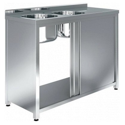 Ванна моечная закрытая (без задней стенки) пристенная, серии Premium, с бортом высотой 45мм, 2 цельнотянутыми мойками 400х400х300мм из нержавеющей стали AISI 304 слева, рабочей поверхностью справа, дверями-купе, имеет сварной каркас из нержавеющей стали AISI 430. Столешница из нержавеющей стали AISI 430 толщиной 1мм усилена ламинированным ДСП толщиной 16мм. Максимальная равномерно распределенная нагрузка на столешницу - до 120кг. Борт препятствует попаданию отходов сырья и влаги в пространство между ванной и стеной. Боковые стенки, двери, дно изготовлены из нержавеющей стали AISI 430 толщиной 0,7мм. Ножки изготовлены из квадратной трубы сечением 40х40мм, из нержавеющей стали AISI 430 толщиной 1,2мм. Регулируемые по высоте опоры позволяют компенсировать неровности пола.