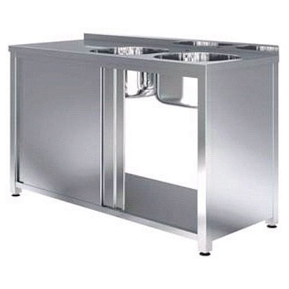 Ванна моечная закрытая (без задней стенки) пристенная, серии Premium, с бортом высотой 45мм, 2 цельнотянутыми мойками 500х500х300мм из нержавеющей стали AISI 304 справа, рабочей поверхностью слева, дверями-купе, имеет сварной каркас из нержавеющей стали AISI 430. Столешница из нержавеющей стали AISI 430 толщиной 1мм усилена ламинированным ДСП толщиной 16мм. Максимальная равномерно распределенная нагрузка на столешницу - до 120кг. Борт препятствует попаданию отходов сырья и влаги в пространство между ванной и стеной. Боковые стенки, двери, дно изготовлены из нержавеющей стали AISI 430 толщиной 0,7мм. Ножки изготовлены из квадратной трубы сечением 40х40мм, из нержавеющей стали AISI 430 толщиной 1,2мм. Регулируемые по высоте опоры позволяют компенсировать неровности пола.