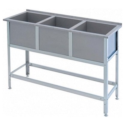 Ванна моечная трехсекционная открытая, серии Standart, со съёмным бортом, 3 сварными мойками из нержавеющей стали AISI 430 толщиной 0,7мм, отверстием под смеситель (заглушка в комплекте), выпуском, оснащена разборным каркасом из оцинкованной стали толщиной 1,5мм из уголка 40х40мм, нижней обвязкой с 4-х сторон из оцинкованной стали толщиной 1,5ммм, 6 ножками, регулируемыми по высоте пластиковыми опорами ножек. Размер мойки - 600х600х400мм.