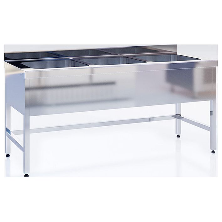 • Ванна моечная трехсекционная выполнена из шлифованной нержавеющей стали толщиной 1,5 мм.