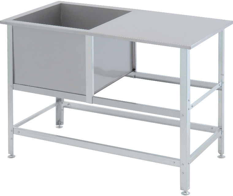 Ванна со столом Atesy ВСМС-Б-1.430-1010.530-02-К (ВМС-1/430-К) устанавливается на предприятиях общественного питания и торговли для мытья столовой и кухонной посуды, инвентаря, овощей и фруктов, а также для оттайки замороженных пищевых продуктов. Каркас профиль из оцинкованной стали толщиной 1,2 мм.
